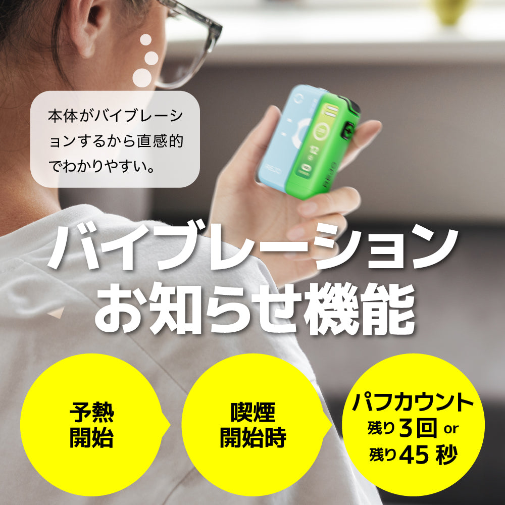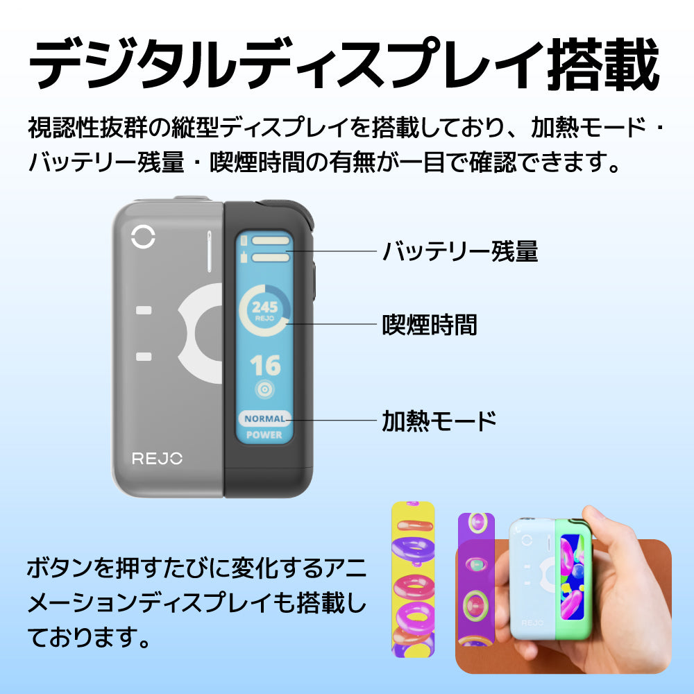 視認性抜群の縦型ディスプレイを搭載しており、加熱モード・バッテリー残量・喫煙時間の有無が一目で確認できます。