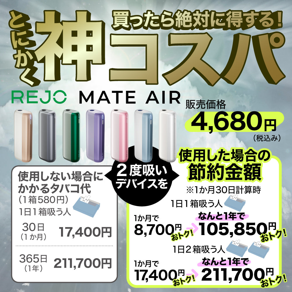 電子タバコ・ベイプ業界で確かな実績を持つ老舗企業が展開する新ブランド REJO(レジョ) より、IQOS ILUMA(アイコスイルマ)用スティックが1台で1本を2度吸える革新的な加熱式タバコデバイス 『 REJO Mate Air (レジョ メイトエア)』 が新登場!