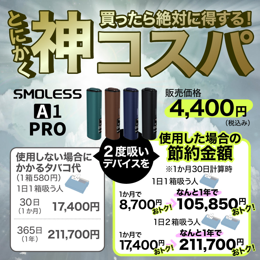 人気爆発中のアイコスイルマやアイコスイルマワンで吸い終えたシケモクを再利用できるアイコスイルマ互換機の 新ブランド ” SMOLESS ”(スモーレス)から、待望の新製品「SMOLESS A1 PRO」が新登場!