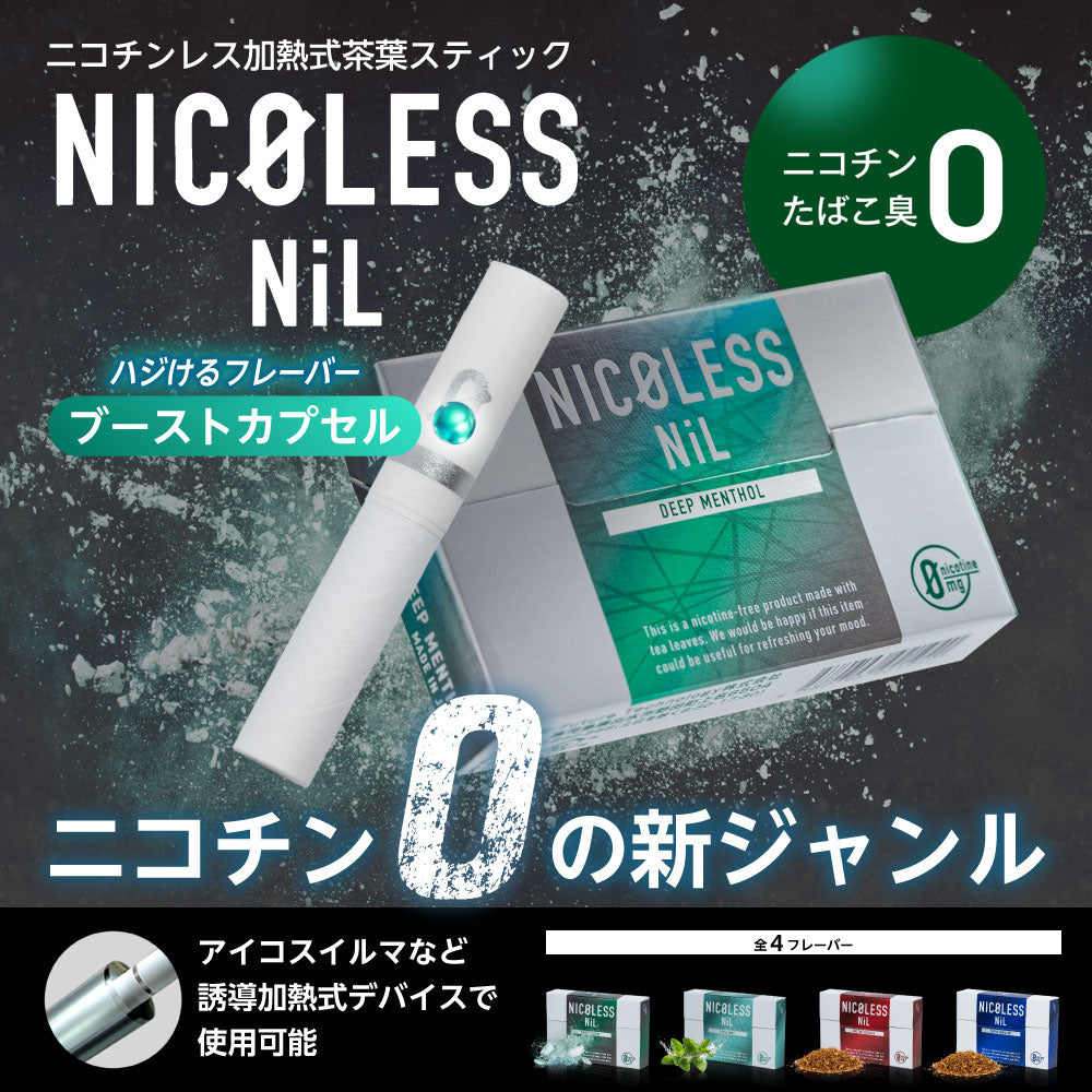 ■加熱式たばこデバイス用ノンニコチン茶葉スティック 「NICOLESS NiL」(ニコレス ニル)がIQOS ILUMA(アイコスイルマ)やIQOS ILUMA PRIME(アイコスイルマプライム)、IQOS ILUMA ONE(アイコスイルマワン)などの誘導加熱式デバイスで喫煙できるようになり、「ニコチンレスは物足りない!」のお声に応えるためにフレーバーカプセルを搭載して新発売!