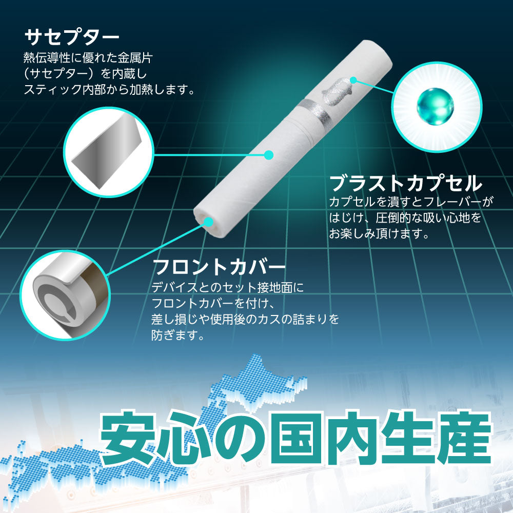 加熱式たばこデバイス用ノンニコチン茶葉スティックが誘導加熱式デバイスで喫煙できるようになりました! 「ニコチンレスは物足りない!」のお声に応えるためにフレーバーカプセルを搭載。 |