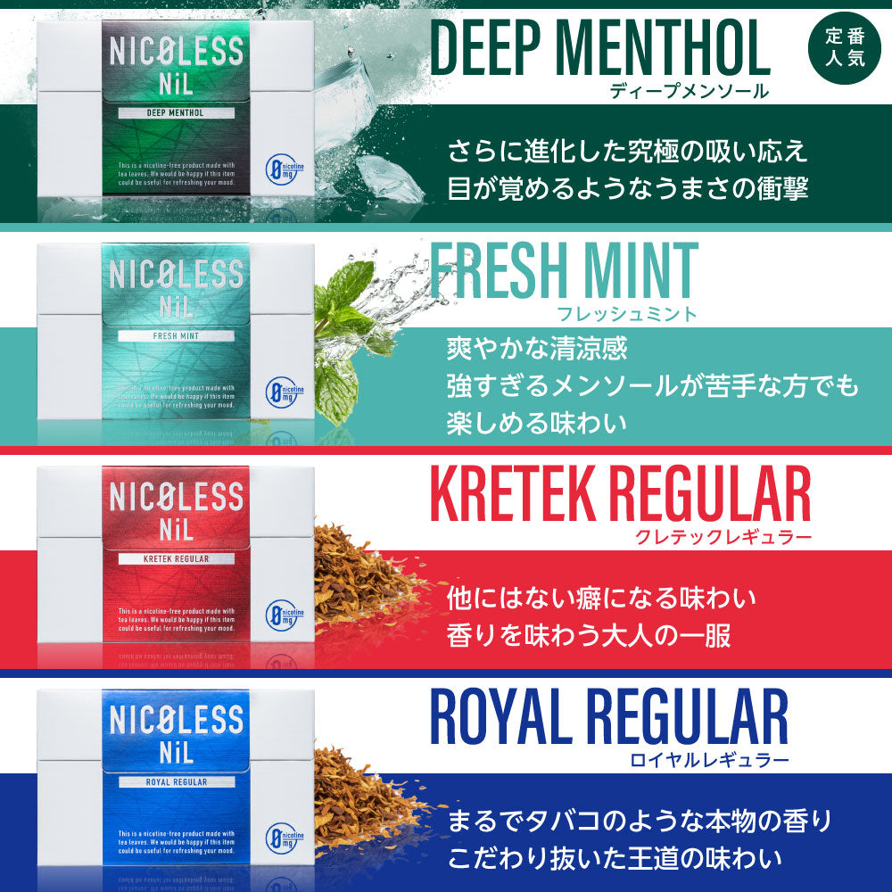 「NICOLESS NiL」(ニコレス ニル)は、ブレードまたはニードルタイプではない誘導加熱式たばこデバイスで使用できます。茶葉を直接加熱できるので抜群の吸い応えと満足感を得られます。 使い方は簡単でデバイスに差し込むだけでご使用いただけます。
