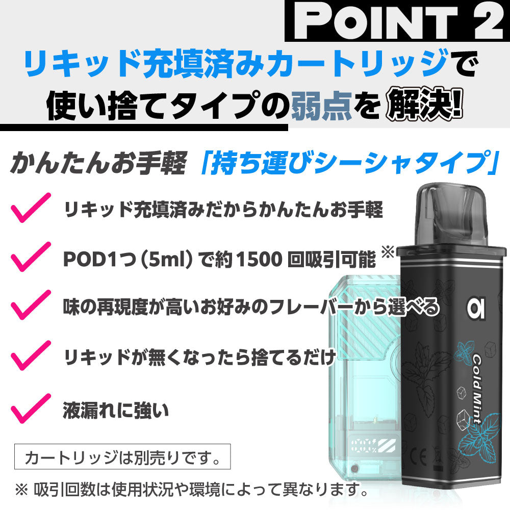 本体はお好みに合わせて使い分けできる2Way仕様のPOD型VAPE(ベイプ)となっており、付属の空カートリッジにお好みのリキッドを注入して圧倒的コスパの「電子タバコタイプ」としての使用はもちろんのこと、別売りのリキッド充填済みのカートリッジ※でかんたんお手軽「持ち運びシーシャタイプ」としても使用できる次世代型の画期的な電子タバコとなっております。 また、お好みのリキッドを注入できる空カートリッジは5回〜10回繰り返し使用することが可能で圧倒的なコストパフォーマンスを実現!
