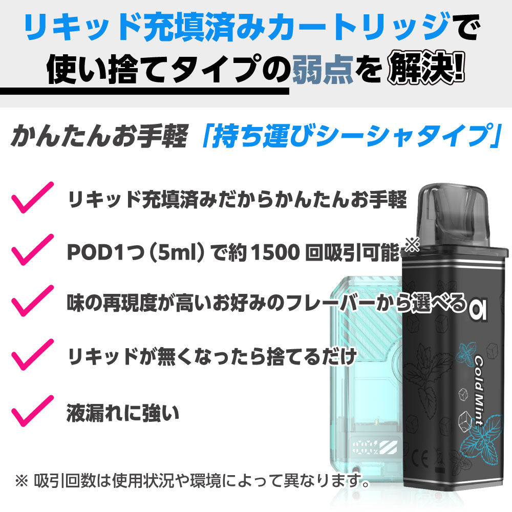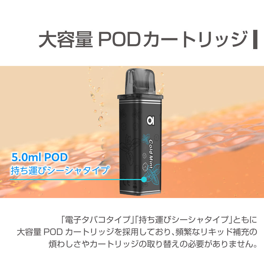 本体はお好みに合わせて使い分けできる2Way仕様のPOD型VAPE(ベイプ)となっており、付属の空カートリッジにお好みのリキッドを注入して圧倒的コスパの「電子タバコタイプ」としての使用はもちろんのこと、別売りのリキッド充填済みのカートリッジ※でかんたんお手軽「持ち運びシーシャタイプ」としても使用できる次世代型の画期的な電子タバコとなっております。 また、お好みのリキッドを注入できる空カートリッジは5回〜10回繰り返し使用することが可能で圧倒的なコストパフォーマンスを実現!