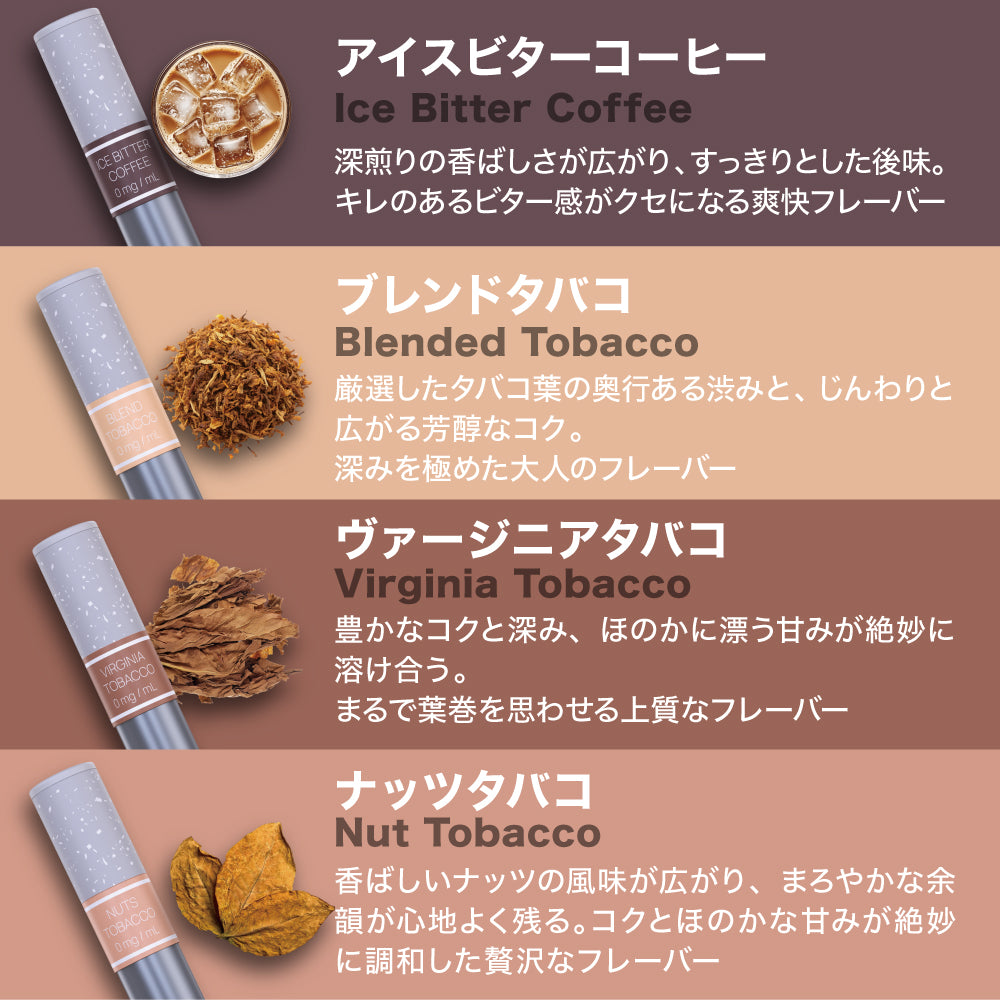 キック感・煙量・味の濃さにこだわった7種のフレーバーで、紙巻きタバコに近い満足感を実現! |