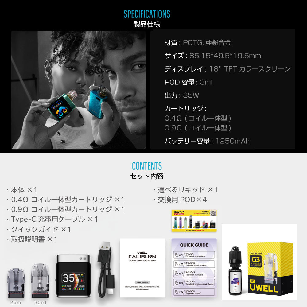 UWELL Caliburn G3 PRO KOKO 交換用POD4個+VAPOREVERリキッド1本セット|ユーウェル カリバーン G3 PRO KOKO