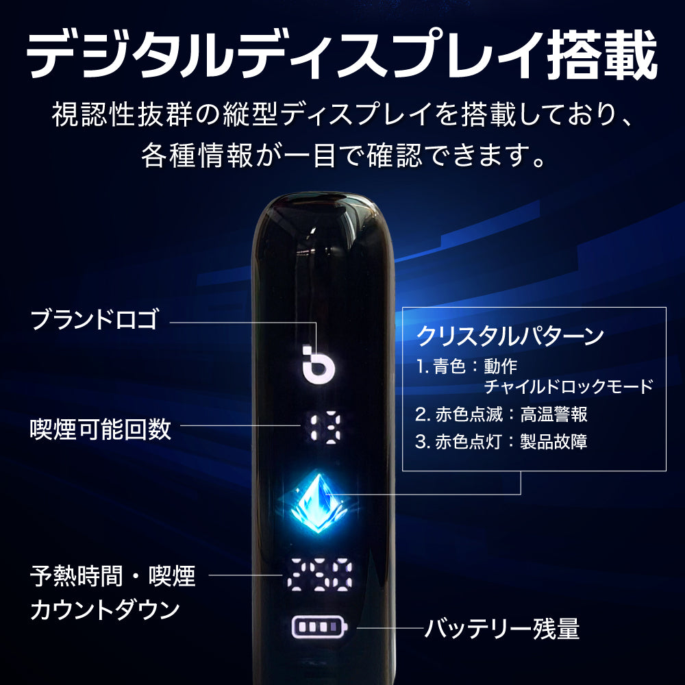 視認性抜群の縦型ディスプレイを搭載しており、加熱モード・バッテリー残量・喫煙時間・パフ回数の有無が一目で確認できます。