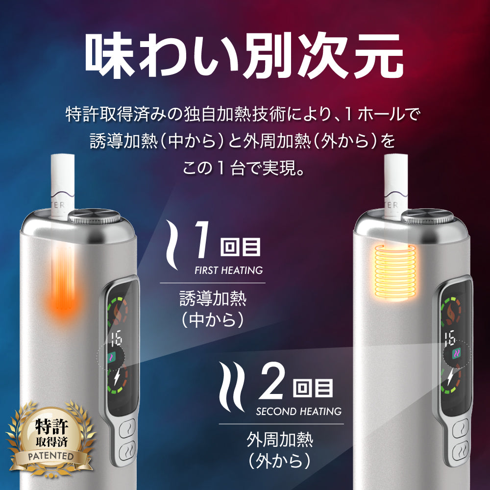 本製品は、IQOS ILUMA(アイコスイルマ)やIQOS ILUMA ONE(アイコスイルマワン)の加熱方式である誘導加熱と円周加熱を掛け合わせた特許取得済みのハイブリットな加熱方式を採用。